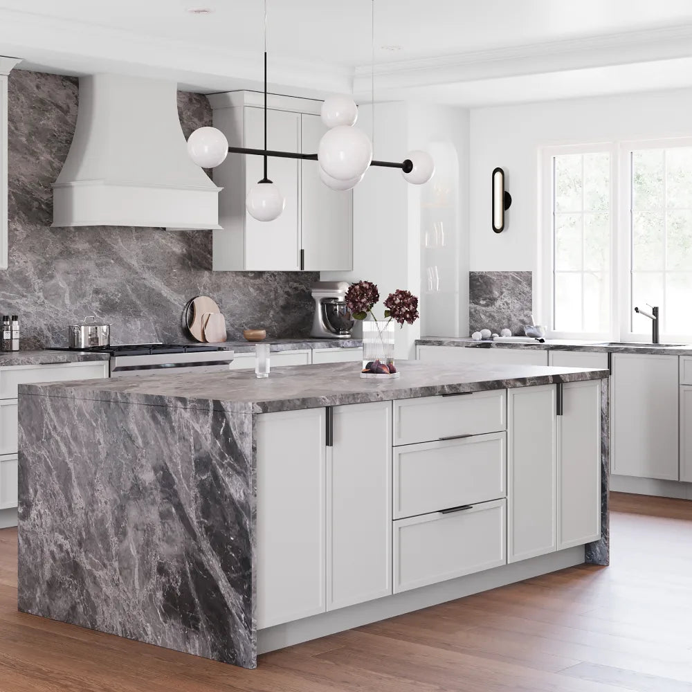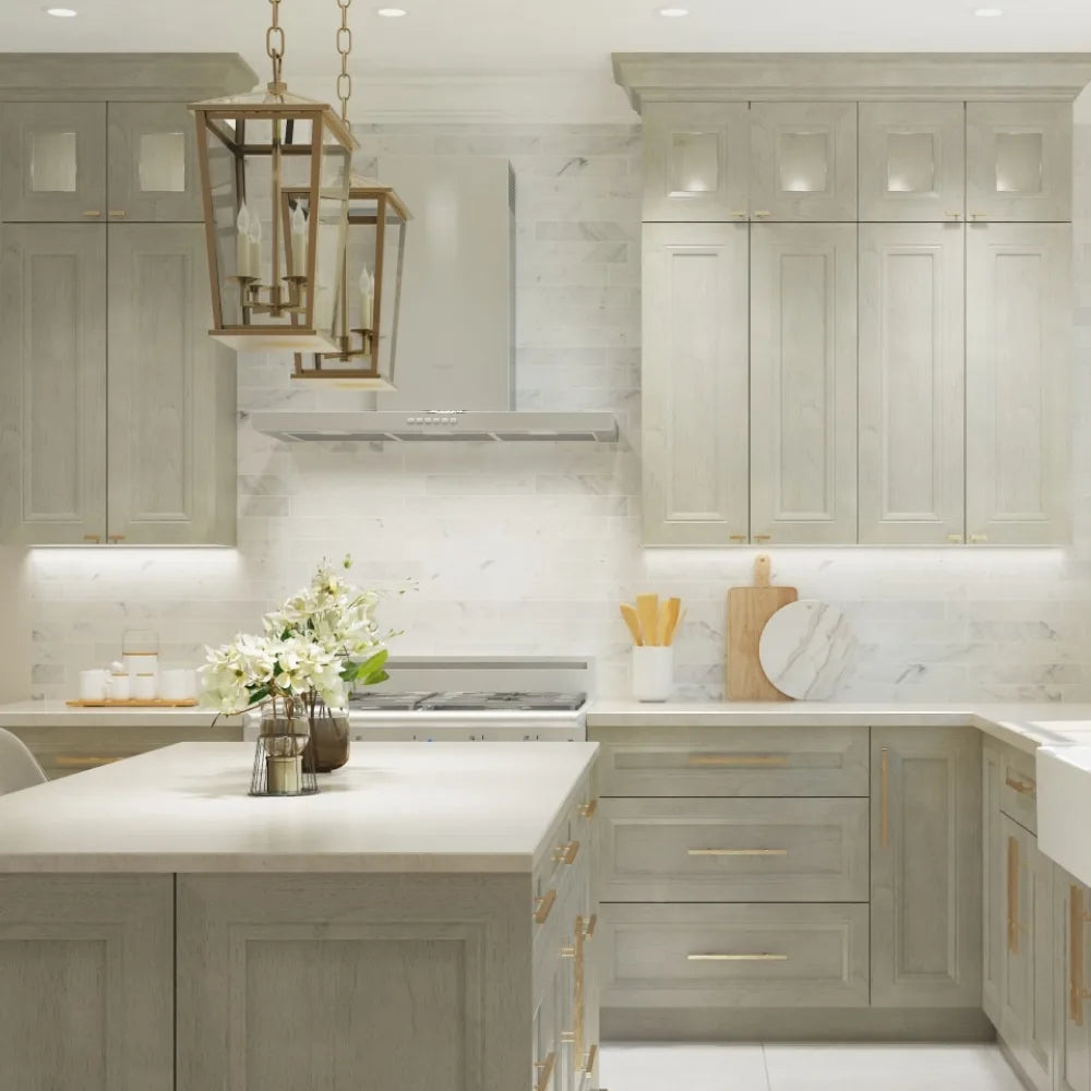 The Richmond door style offers a touch of refined elegance with its mitered flat panel design and delicate accent molding. Available in a warm light grey stain or a crisp white painted finish, Richmond perfectly complements transitional kitchen designs.